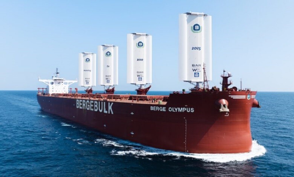 James Marshall-led Berge Bulk has shown off its retrofitted newcastlemax bulker, Berge Olympus, which now houses four BARTech WindWings by Yara Marine Technologies. The WindWings installation is part of Berge Bulk’s ambition to become carbon neutral by 2025 with the shipowner claiming today the Berge Olympus is the world’s most powerful sailing cargo ship.