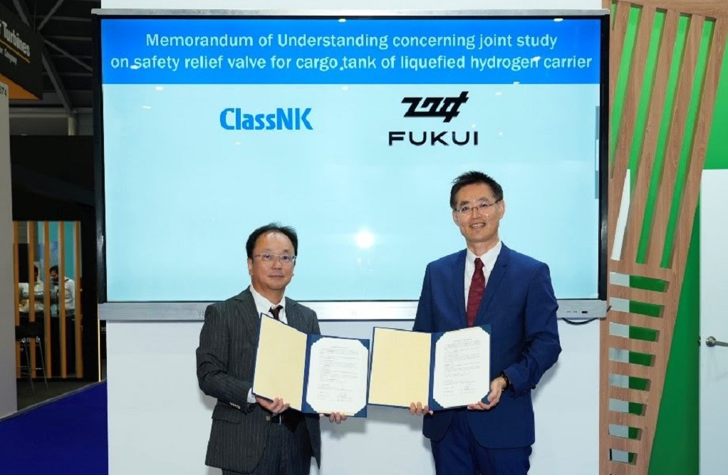 Fukui Seisakusho Co., Ltd. (FUKUI) and ClassNK have signed a Memorandum of Understanding concerning a joint study on a safety relief valve for a cargo tank of liquefied hydrogen carriers at the “Gastech2023” held in Singapore.